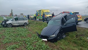 Na ulici K dálnici u Pitkovic zasahují pražští hasiči u dopravní nehody dvou osobních vozidel. Na místo míří vrtulník LZS.
