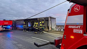 Jednotky ze tří pražských stanic zasahují na ulici Kbelská u dopravní nehody kamionu, který se převrátil na bok. Vozidlo prorazilo ochranné zábradlí a částí vozidla je mimo komunikaci. Hasiči řeší únik provozních kapalin a vozidlo zajistili.