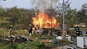 Hasiči ze Strašnic společně s hasiči Správy železnic zasahují u požáru příbytku bezdomovců v ulici V Korytech v Praze 10. Jednotky používají dva vodní proudy, na místě se nikdo z bezdomovců nenacházel.